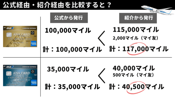 紹介経由の場合は「ANAアメックスカード:公式より14,000マイル増」「ANAアメックスゴールド:公式より21,500マイル増」のキャンペーン内容になっているぞ!
