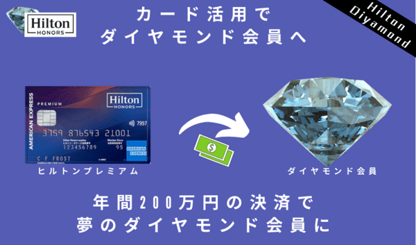 ヒルトンアメックスプレミアムカードを保有し、年間200万円の決済を達成するだけで、夢のダイヤモンド会員になれるチャンスです!