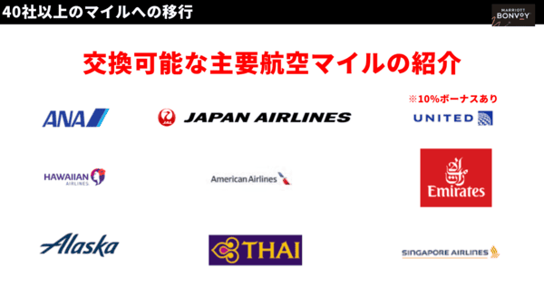 - ANA、JAL、UA、アメリカン航空などマイル交換可能