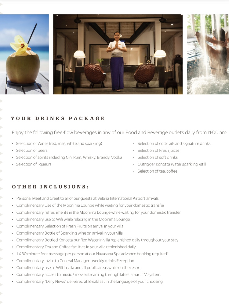 基本プランとしてフルボード(3食付き)にプラスして、オールインクルーシブプラン(アルコール飲み放題/98$(1泊1人当たり))をつけて、完全なオールインクルーシブプランにしました。