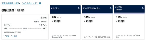 普通に検索をすると往復で約353,000円と非常に高い金額設定となっています! UAマイルを活用をすればビジネスクラスの往復は110,000マイル(片道55,000マイル)